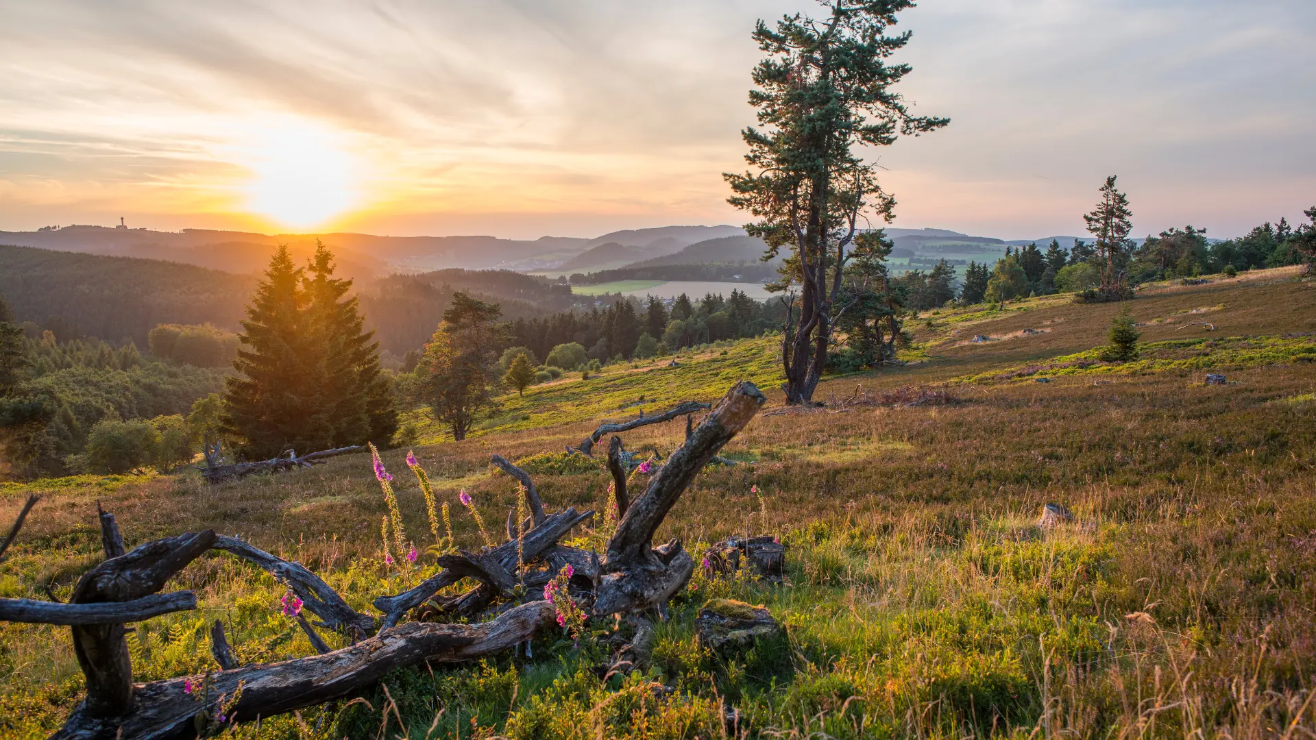 Die Vielfalt der Landschaft: Erleben Sie den Kontrast zwischen dem satten Grün der Wälder und der einzigartigen Hochheide auf dem Ettelsberg – besonders im Spätsommer ein lila Blütenmeer.